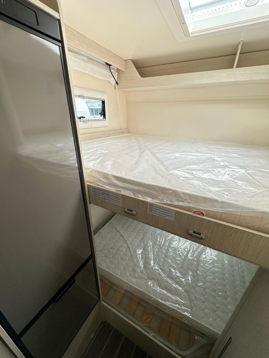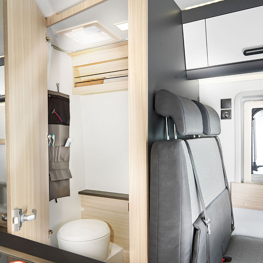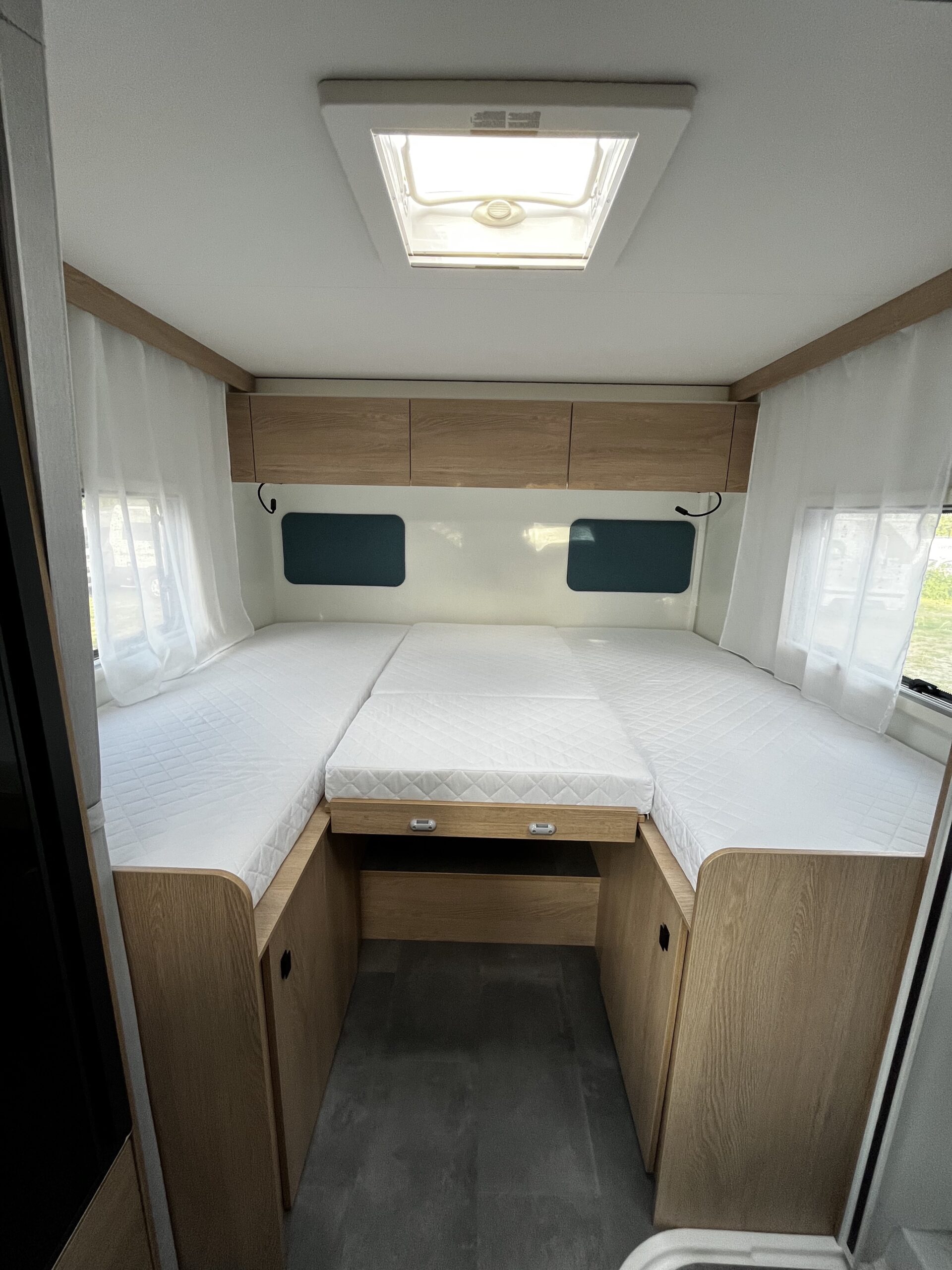 Unser Camper Steglitz ist komfortabel wie flexibel. Es ist eine neue Modellreihe des etablierten Herstellers Pilote, die erst seit 2022 auf dem Markt ist mit vielen modernen Features. Er verfügt über ein einzigartiges Design. bietet ein Schwenkbad, zudem lassen sich der vordere und hintere Bereich voneinander abtrennen. Durch die Längsbetten gibt es einen hohen Komfort, denn Ihr könnt in Einzelbetten schlafen oder diese zu einer großen 146 cm x 190 cm-Liegewiese verbinden. Verreist Ihr mit der ganzen Familie oder Freund*innen, so könnt Ihr mit dem elektrischen Hubbett ganz einfach zwei zusätzliche Schlafplätze schaffen. Dafür wird ein Bett über der Sitzgruppe runtergeklappt, so dass tagsüber nichts im Wege ist und auch nichts umgebaut werden muss. Die 193 cm Stehhöhe und die Panorama-Fenster machen ein tolles, helles Raumgefühl. Die große, vollständig isolierte Garage ist über die 88 cm x 88 cm-Zugangstür leicht zu erreichen.