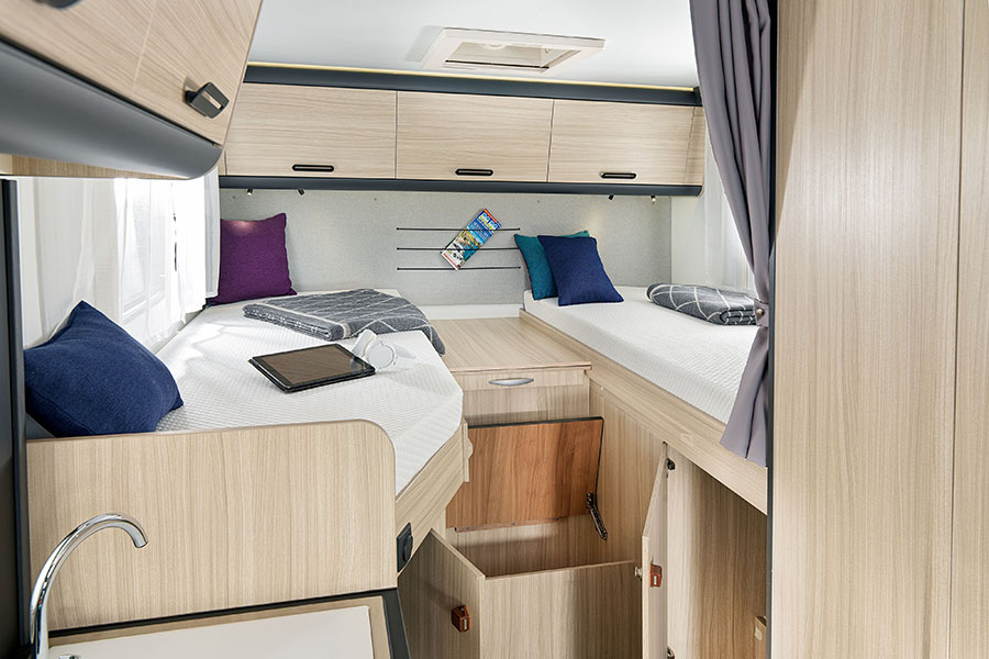 Der Teilintegrierte ist der am flexibelsten Einsetzbare unserer Camper. Durch die Längsbetten gibt es einen hohen Komfort, denn Du kannst in Einzelbetten schlafen oder diese zu einer großen Liegewiese verbinden. Verreist Du mit der ganzen Familie oder Freund*innen, so kannst Du mit dem Hubbett ganz einfach zwei zusätzliche Schlafplätze schaffen. Dafür wird ein Bett über der Sitzgruppe runtergeklappt, so dass tagsüber nichts im Wege ist und auch nichts umgebaut werden muss. Schau Dir hier eine Videotour durch das Wohnmobil mit vielen Funktionen an.