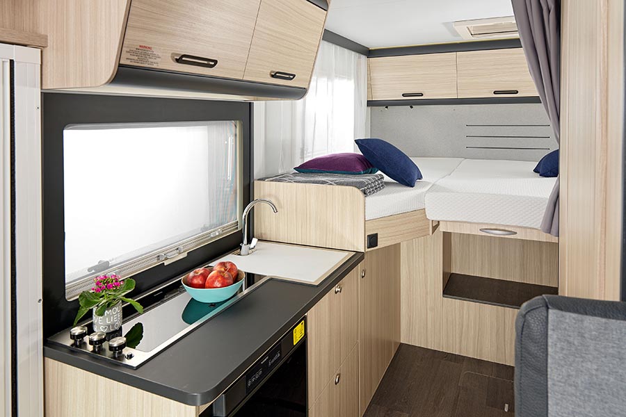 Der Teilintegrierte ist der am flexibelsten Einsetzbare unserer Camper. Durch die Längsbetten gibt es einen hohen Komfort, denn Du kannst in Einzelbetten schlafen oder diese zu einer großen Liegewiese verbinden. Verreist Du mit der ganzen Familie oder Freund*innen, so kannst Du mit dem Hubbett ganz einfach zwei zusätzliche Schlafplätze schaffen. Dafür wird ein Bett über der Sitzgruppe runtergeklappt, so dass tagsüber nichts im Wege ist und auch nichts umgebaut werden muss,